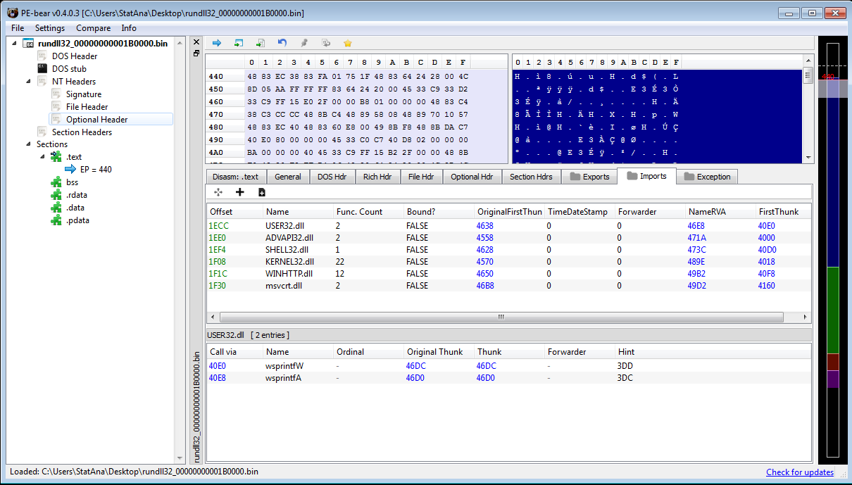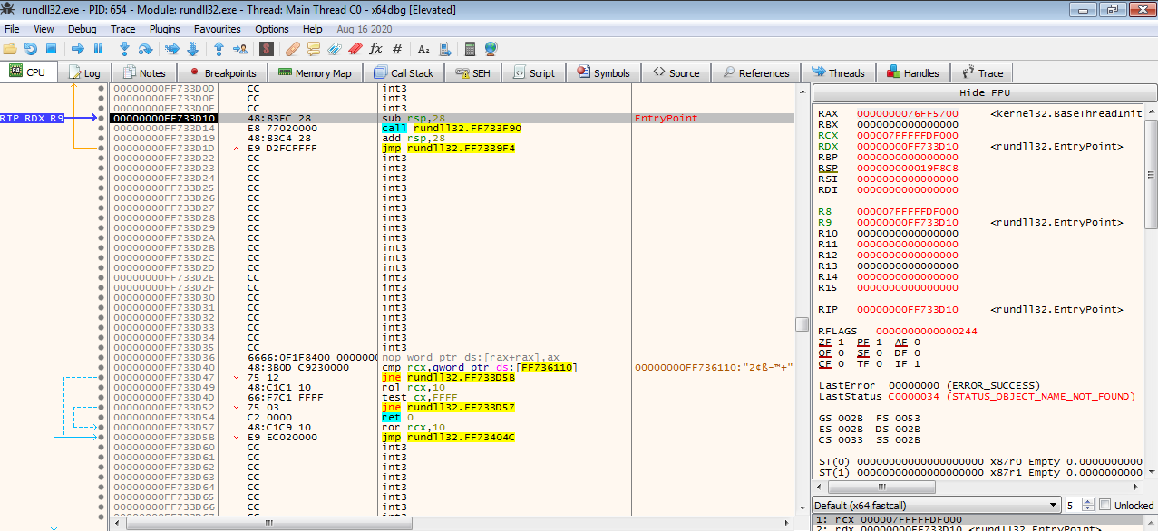 Hitting F9 (Run) or clicking on the right arrow places us in the Rundll process