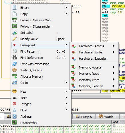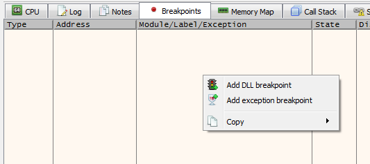 Going to the breakpoint tab, right clicking gives this menu. You can add a “dll breakpoint”, so when the debugger enter the dll, it stops