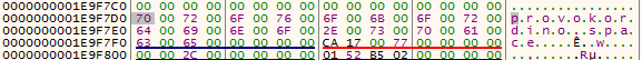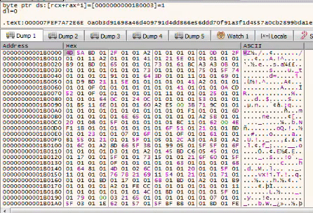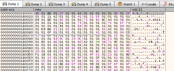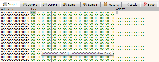 Let’s hit the “Execute until return” button. The value stored in RAX after this is the address of the allocated memory region. In my case it’s 0x01B0000. Following it in dump :