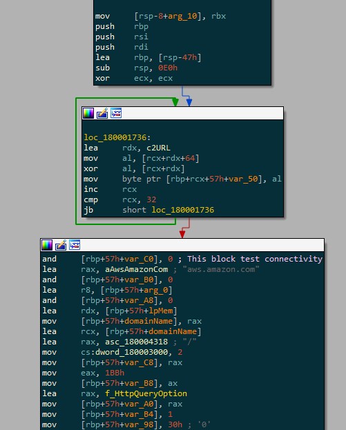 💡 : There is two call to this API, the first one is to “aws.amazon.com” in order to check if there is an internet connection (and also an anti sandbox)