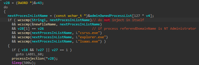 It enumerates running process (T1057)checks if the process is one of csrss.exe, explorer.exe, lsaas.exe or is run under NT Admin and then injects into it, using WriteProcessMemory and CreateRemoteThread (T1055).