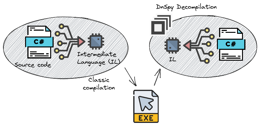 As we saw, .NET malware can be hard to work with, because of the various mechanisms Threat Actors uses. But they do so because .NET by design is rather easy to analyze. Remember the schema I did just before? We can actually decompile the generated executable with awesome tools like DnSpy.