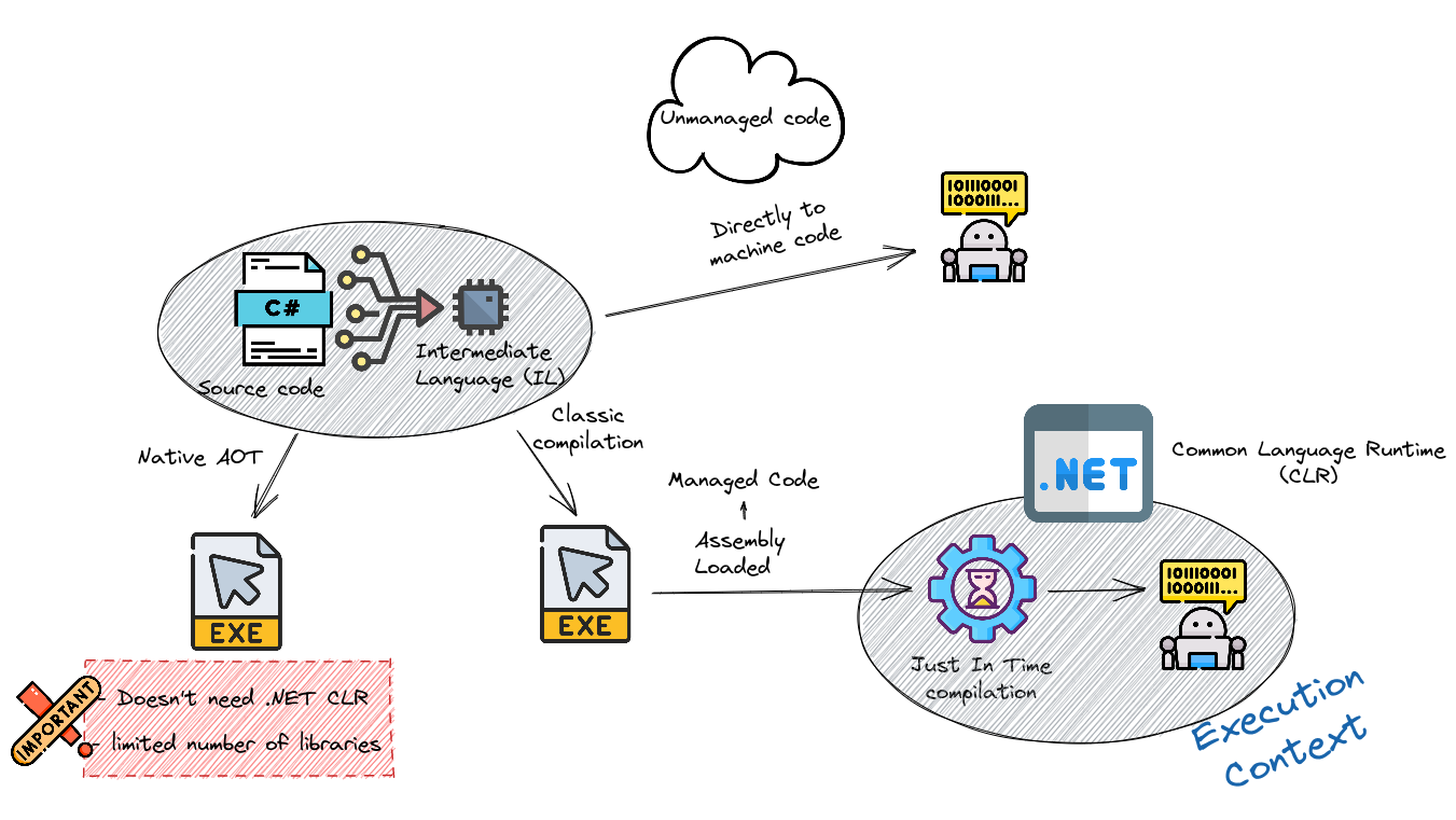 💡 : There is a functionnality called Ahead Of Time that compiles the code directly to native code and doesn’t need the JIT compiler to run while still being managed code. It’s brand new in .NET7 ! - It only supports a limited number of libraries in .NET 7.