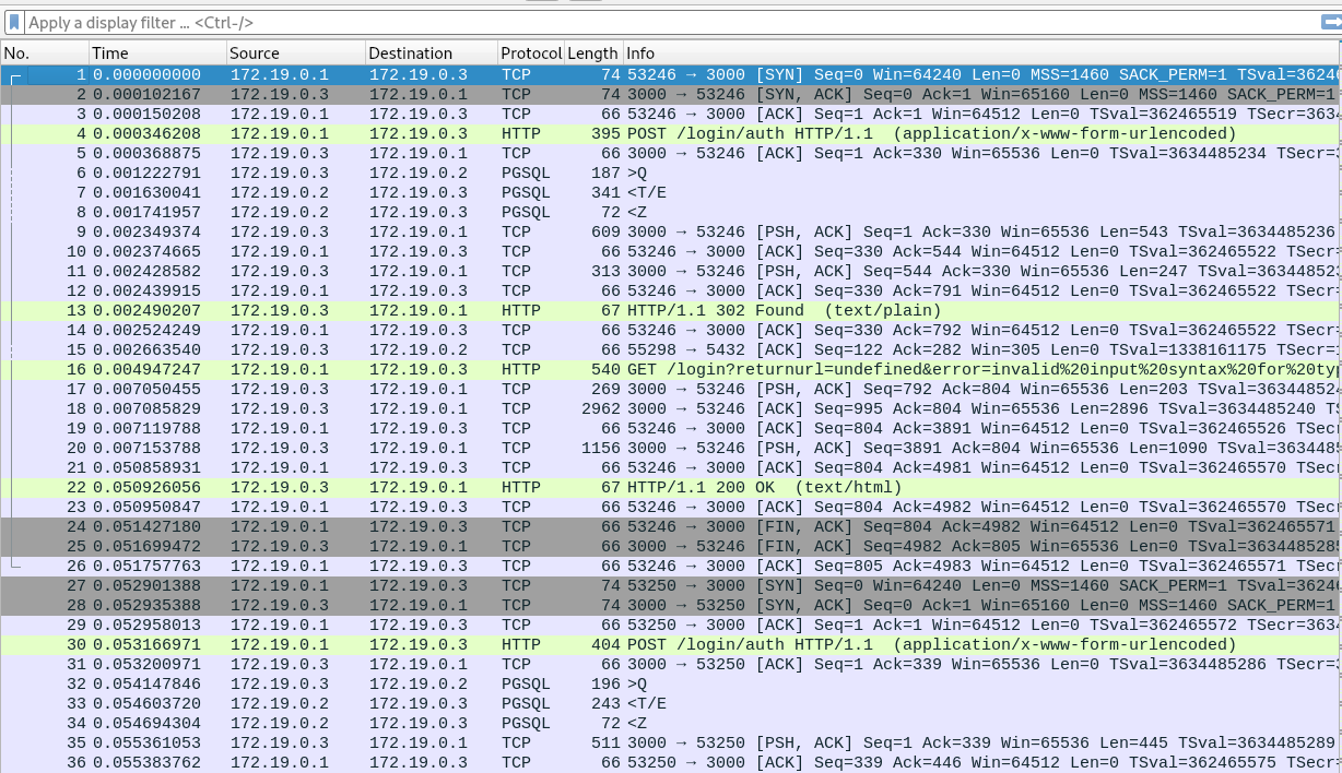 A pcapng file is given. Opening it with Wireshark, we see HTTP and PGSQL protocol.