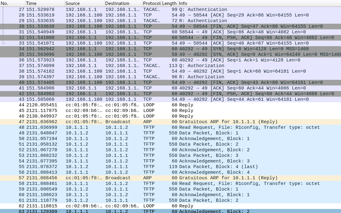 OK, so we got TFTP and TCACS+ protocol, interesting. Looking at the TFTP protocol, I was able to extract the R1config. This file the config file for Cisco router.